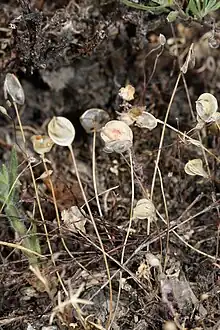 Idahoa is a monotypic genus of plants in the family Brassicaceae containing the single species Idahoa scapigera, which is known by the common names scalepod and oldstem idahoa. It is native to western North America from British Columbia to California to Montana where it grows generally in mountains and foothills. This is a petite annual herb growing a basal rosette of petioled leaves each one to three centimeters long and smooth or lobed along the edges. The thin, leafless erect stems rise to a maximum height near ten centimeters. Each bears a single tiny flower with white petals above red-purple sepals. The fruit is a flat, round capsule, shaped like a disc or somewhat oval, and 6 to 12 millimeters wide. The green fruit dries to a papery gray or white.