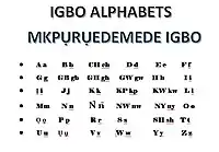 The modern Igbo alphabet (Igbo: Mkpụrụ Edemede Igbo), otherwise known as the Igbo alphabet (Igbo: Mkpụrụ Edemede[1] Igbo), is the alphabet of the Igbo language, it is one of the three national languages of Nigeria.[2] The modern Igbo alphabet is made up of 36 letters,[3] which includes only a 23-letter set of the ISO basic Latin alphabet minus C, Q, and X, which are not part of Abidịị Igbo. The alphabet uses the dot above on the letter Ṅ, and the dot below on Ị, Ọ and Ụ.