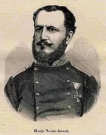 At the outbreak of the Serbian-Ottoman War in June 1876, Čolak-Antić was appointed commander of the Čačak brigade, his brother Lazar's unit was attached to the main army of Mikhail Chernyayev in command of the Kruševac brigade, while their other brother Ljubomir Čolak-Antić ran the arsenal in Kragujevac.[8] On 8 July Čolak-Antić leading the Ušica Division managed to repulse the Ottomans, crossing the border at Raška pushing them back towards Novi Pazar.[9] On the proposal of the Minister of Defense, on 7 July 1876, the government decided to issue a law on "awards for meritorious service in war" with Čolak-Antić one of the first recipient. Prince Milan Obrenović (future Serbian king) awarded him the Order of the Cross of Takovo for bravery.[10]
