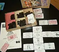 The game is played with a deck of special cards, money chips (representing "millions of dollars in low-denomination unmarked banknotes") and two six-sided dice. There are three types of cards: