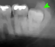 Pericoronitis (green arrow) in lower right wisdom tooth