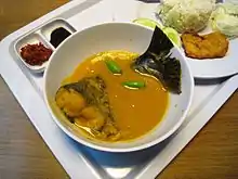 Rice has been an essential staple for Indonesian society, as bas-reliefs of 9th century Borobudur and Prambanan describes rice farming in ancient Java. Ancient dishes were mentioned in many Javanese inscriptions and historians have succeeded in deciphering some of them. The inscriptions from Kingdom of Mataram era circa 8th to 10th century mentioned several ancient dishes, among others are hadaŋan haraŋ (minced water buffalo meat satay, similar with today Balinese sate lilit), hadaŋan madura (water buffalo meat simmered with sweet palm sugar), and dundu puyengan (eel seasoned with lemon basil). Also various haraŋ-haraŋ (grilled meats) either celeṅ/wök (pork), hadahan/kbo (water buffalo), kidaŋ/knas (deer) or wḍus (goat).[16] Ancient beverages include nalaka rasa (sugarcane juice), jati wangi (jasmine beverage), and kinca (tamarind juice). Also various kuluban (boiled vegetables served in spices, similar with today urap) and phalamula (boiled yams and tubers served with liquid palm sugar).[17] Other ancient vegetable dishes include rumwah-rumwah (lalap), dudutan (raw vegetables) and tetis.[18]