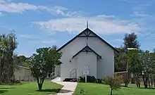 Our Lady of the Southern Cross Catholic Church is on the western corner of George and Elizabeth Streets (28°24′49″S 151°04′50″E / 28.4136°S 151.0806°E / -28.4136; 151.0806 (Our Lady of the Southern Cross Catholic Church, Inglewood)).[23]