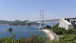The Innoshima Bridge (因島大橋, Innoshima Ō-hashi) is a Japanese suspension bridge, part of the 59 kilometer Nishiseto Expressway linking the islands of Honshu and Shikoku. Completed in 1983, it has a main span of 770 metres (2,526 ft) and connects Mukaishima, Hiroshima with Innoshima, Hiroshima.