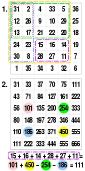 Using a summed-area table (2.) of an order-6 magic square (1.) to sum up a subrectangle of its values; each coloured spot highlights the sum inside the rectangle of that colour.
