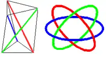 Prismatic tensegrity space filling unit cell of a minimal concept. The red, blue and green rods exert compressive repulsions, the black lines represent attractive tensions. The Borromean link shown is regarded as a resonance form (c.f. tautomerism[5]) of Pask's minimal persisting concept triple.