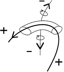 The figure shows Pask's "repulsive carapace" force surrounding a concept. It is shown by the minus sign, it has a clockwise or anticlockwise spin – compare Spin. The spin signature is determined by the residual parity of a braid which is the thick line enclosed by the cylinder. The plus sign labels a process seeking closure by "eating its own tail". Three of these toroidal structures can produce a Borromean link model of the minimal stable concept.[4] Pask said the prismatic tensegrity could be used as a model for the interaction in a Borromean link.