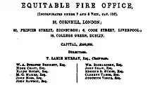 Although the Equitable Fire Insurance Company was not a subsidiary of the National Loan, the two companies were related. Both were stock companies owned by a large number of investors, and ownership might have been shared by the same investors. But regardless of whether or not there were common owners, there were five individuals who were directors of both companies and one of them was T. Lamie Murray (who also was chairman of both boards of directors). The two companies appeared together in the same advertisements and initially shared the same address in London.[54] Management of Equitable Fire acknowledged that their company had been "brought out under the powerful auspices" of the National Loan.[55]
