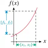Mathematically, instead of working with an uncertain real-valued variable , interval arithmetic works with an interval that defines the range of values that can have. In other words, any value of the variable lies in the closed interval between and . A function , when applied to , produces an interval which includes all the possible values for for all .