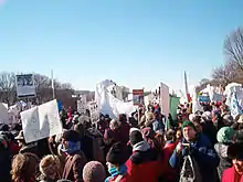 Many of the protests were said to be smaller than those in the same cities a month ago; exceptions were Montreal, which upped its turnout to 200,000 and Dublin where 130,000 demonstrated. The Montreal turnout may have been related to solidarity against American anti-French sentiment, which was a common theme for many of the protesters.[37] A further 15,000 protested in Quebec City.[38] 55,000 protested in Paris, and 4,500 to 10,000 in Marseilles. 100,000 protested in Berlin, some 20,000 protested in Athens, close to 10,000 people marched in Tokyo, and tens of thousands in Washington, D.C. Organizers claimed between 30,000 and 45,000 people turned out, while The Oregonian and the Associated Press estimated between 20,000 and 25,000 people attended, closer to the number in Portland who participated in the January 18 protest.[39] Thousands more marched in cities worldwide including Bangkok, Seoul, Hong Kong, Amman, Chicago, Calcutta, Melbourne, Christchurch, Dunedin, Paris, London, Portsmouth, Leeds, York, Exeter, Newcastle upon Tyne, Frankfurt, Nuremberg, Zürich, Copenhagen, Stockholm, Nicosia, Monaco, Santiago de Chile, Havana, Buenos Aires, Moscow, Seattle, Chicago, San Francisco, Los Angeles, Atlanta, Vancouver, Halifax, Ottawa, and Toronto, as well as cities in Yemen, Turkey, Israel, and the Palestinian territories.[37][40][41][42][43][44]