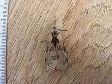 The wingspan is about 30 mm for males while females are wingless. Males have a pattern of light and dark brown markings on the forewings and plain brown hindwings.