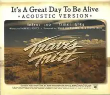 "It's a Great Day to Be Alive" is a song written by Darrell Scott. It was originally recorded by American country music artist Jon Randall, of whose version was to have been included on an album titled Great Day to Be Alive, which would have been released in the late 1990s via BNA Records.[2] Scott released his own version of his song on his 1997 album Aloha from Nashville.
