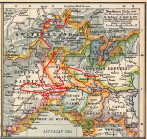 ![]() Map of Suvorov's campaign in Italy and Switzerland in 1799 | |||||||