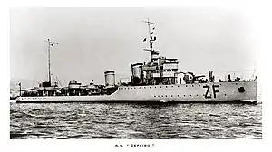 Zeffiro was laid down by Gio. Ansaldo & C. at their Genoa-Sestri Ponente shipyard on 29 April 1925, launched on 27 May 1927 and completed on 15 May 1928.[1] Upon her completion Zeffiro, together with Espero, Ostro and Borea, was assigned to the 1st Squadron of the I Destroyer Flotilla based at La Spezia.[5] Between 1929 and 1932 she carried out several training cruises in the Mediterranean.[6] In 1932 during the training exercises she was hit by a defective torpedo launched by Aquilone.[6] In 1931 Zeffiro together with Euro, Espero and Nembo as well as old cruiser Ancona were part of II Naval Division.[7] In 1934 after another reorganization Zeffiro as well as Espero, Ostro and Borea were again reunited, now forming the 4th Destroyer Squadron, part of II Naval Division.[8]