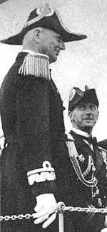 One of the most skilled officers in the Polish Navy, Unrug was quickly promoted to Counter Admiral. In 1924, he came into conflict with Admiral Kazimierz Porębski and was put on a paid leave for a year.[1] In 1925, Porębski had to resign in a scandal after he was discovered taking bribes. Overcoming his limitations in the Polish language, he became Commander of the Fleet of the Polish Navy in 1925. Unrug's task as commander of the Marynarka was largely to train officers for the nascent force.[5] Unrug was respected, but not loved as he imposed a very strict discipline.[5] The Marynarka in the interwar period tended to favor the Mahanian concept of a fleet strong enough to dominate the Baltic, which would allow ships from Poland's ally France to enter the Baltic and deliver supplies to Poland.[6] However, the vast cost of buying warships caused successive governments in Warsaw to balk at the immense expenditure that this would entail and to reject the "green water navy" plans of the Marynarka. This was all the more so as the Franco-Polish alliance of 1921 committed France to go automatically go to war if Poland were attacked, which would mean that Poland in a sense could "borrow" the services of the French Navy which was expected to enter the Baltic to ensure that French supplies would reach Poland. In the late 1920s, the Sanation regime had decided to buy a force of 9 mine-laying submarines with the intention of protecting Poland's coastline.[7] However, as Poland lacked sufficient funds to buy submarines, a loan from France was necessary, and the French made extending the loan conditional upon the Poles also buying two destroyers.[7] In this way, the Marynarka acquired two destroyers despite the doubts of Marshal Józef Piłsudski, Poland's de facto leader, about the need for the two destroyers.[8] The Marynarka ended up with the two French-built destroyers, ORP Wicher and the ORP Burza together with the French-built submarines Wilk, Żbik, and Ryś. [7]