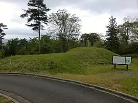 The Miyoshi Basin in the Chugoku Mountains of former Bingo Province has one of the most dense concentration of burial mounds in the Chugoku region. The Jōrakuji-Nanatsuzuka cluster is one of the largest of these, and is located on a hill on the west bank of the Mihara River in the southeastern part of the Miyoshi Basin. The burial mounds are divided into north and south groups. In the Jōrakuji cluster on the north side consists of a total of 116 kofun, including one scallop-shaped (hotategata-kofun (帆立貝形古墳)), 97 circular-type (empun (円墳)), and 18 square-type (hōfun (方墳)). Mound No.12. the largest in this cluster, is a circular burial mound measuring 6 meters in height and 55 meters in diameter.[2]