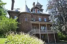 The Charles H. Farnam Residence at 28 Hillhouse Avenue in New Haven was built in 1884 for attorney Charles Henry Farnam.[5]: 31 Its design is eclectic but has similarities to Dutch Colonial style.[5]: 32 The red brick house has arched windows and an octagonal corner tower, Yale University has owned the structure since 1920 and uses it for the Department of Economics.[5]: 31–32
