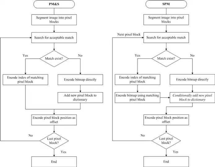 Pattern matching and substitution (PM&S) is the more classic coding method. The encoder performs image segmentation to isolate character-sized chunks. For each individual chunk, the encoder looks for a match in the bitmap dictionary. If a match exists, we code an index of the corresponding representative bitmap in the dictionary and the position of the character on the page. The position is usually relative to another previously coded character. If a match is not found, the segmented pixel block is coded directly and added into the dictionary. Typical procedures of pattern matching and substitution algorithm are displayed in the left block diagram of the figure above. Although the method of PM&S can achieve outstanding compression, substitution errors could be made during the process if the image resolution is low.[11]