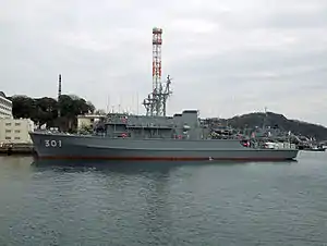 She was the first minesweeper of the Maritime Self-Defense Force.[5] The 1989 plan minesweeper No. 301 based on the medium-term defense capability development plan was laid down at the Hitachi Shipbuilding Kanagawa Plant on August 30, 1990, launched on August 29, 1991, and launched on March 16, 1993. It was put into service, and was incorporated into the 2nd Mine Warfare Force as a ship under direct control and deployed in Yokosuka. On March 23, the same year, the 51st Mine Warfare Force was newly formed under the 2nd Mine Warfare Force, and was incorporated with the second ship JS Tsushima commissioned on the same day.