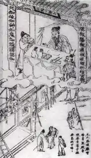 Illustration from the Jade Record: underworld king Biang-cheng sitting at his desk and ruling over the sixth level of hell. An assistant in scholar's clothes presents the sinner's record; a demon is set to supervise the punishment.