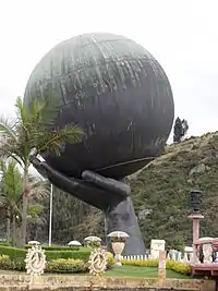 The park contains replicas of the Taj Mahal in India, as well as replicas of the Seven Wonders of the Ancient World.[4] It also has several monuments, including a large hand holding a globe, which is the emblem of the park, meant to represent the hand of God. Inside the replica of Taj Mahal, there are reproductions painted in ceramic of great works of world art and the Cyclorama of Colombian Independence (in Spanish: Ciclorama de la Independencia Colombiana), a 165-meter-long and 7-meter-high mural that represents the entire process of that country's independence since the Revolution of the Comuneros in 1781, the Cry of Independence and the Battles of the Vargas Swamp and the Boyacá Bridge in 1819.[5][6][7]