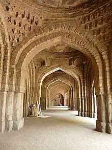 The Jamali Kamali mosque, positioned in an enclosed garden area, built first during the years 1528-29, has a southern entry. It is built in red sandstone with marble embellishments. It is claimed to be a forerunner in the design of Mughal mosque architecture in India. The prayer hall, fronted by a large courtyard, has five arches with the central arch only having a dome. The size of arches increases towards the central arch, which is the largest of the five arches embellished with beautiful ornamentation. The spandrels of the arch are decorated with medallions and ornamentation. Fluted pilasters exquisitely decorate the central arch. The prayer wall on the west has niches with mihrab. The niches and walls are decorated with a few Koranic inscriptions. A porch around the mosque provides access to the two storied mosque and the four corners are adorned by octagonal towers. The rear end of the mosque has been provided with oriel windows, apart from a small window on the central arch.[1]