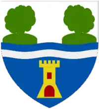 Per fess Argent and Azure a Fess wavy per fess wavy Azure and Argent two Bushes upon Mounds Vert in chief and a Tower Or Window and Port Gules in base