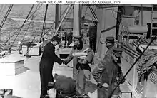 ![]() Captain James. H. Tomb, Commanding Officer of USS Aroostook (ID # 1256), shakes hands with Lieutenant Commander Patrick N.L. Bellinger (May 1919) | |