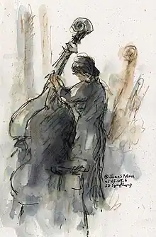 This 2005 watercolor and ink wash entitled "Concert Strings" was painted by James Pollock on stage as part of a unique collaboration event between the South Dakota Symphony Orchestra and seven South Dakota Plein air Artists. Copyright 2005 James Pollock.