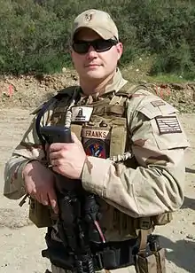 Seeking to further his skills with firearms, Franks sought out special training with the Navy. Initially he trained as an Operations Specialist and later applied to and was accepted in the Navy SEAL's BUD/S program. He was unable to complete BUD/S due to medical reasons. Franks graduated from the Navy Expeditionary Combat Skills and Practical Weapons courses and Anti-Terrorism Force Protection/Deadly Force Training. He continued to work as an Operations Specialist and Navy Rescue Swimmer on six overseas deployments including tours in Afghanistan in 2009, 2010 and 2011. While in Afghanistan Franks was assigned to a Counter-IED task force.[3]
