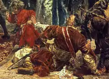 b ^ There are several different versions of the story, which could be explained by the fact that Suchorzewski was known for theatrical gestures and declarations, some of which might have been differently described by contemporary sources (which could have conflated several incidents into one). Bartoszewski cites several versions and incidents of Suchorzewski's theatrics. In one, Suchorzewski would threaten his son upon return to his house, causing a large commotion there.[16] In another, Suchorzewski would simply declare his intention, without even moving to threaten his son.[24] In yet another one, that Bartoszewski describes three times in a slightly different fashion, Suchorzewski would try to block the king's way, imitating Reytan's gesture, but without involving his son.[18][25][26] At another time, he would crawl on the parliament's floor, and deliver a speech in this fashion, an incident which caused the bishop Adam Krasiński to demand that "somebody take this insane person to the asylum".[26]