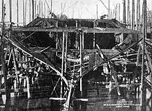Hatsuse, named after the Hase-dera temple, which was famous for its maple trees,[5] was ordered as part of a 10-year Naval Expansion Programme paid for from the £30,000,000 indemnity paid by China after losing the Sino-Japanese War of 1894–1895.[6] The ship was laid down by Armstrong Whitworth at their Elswick shipyard on 10 January 1898. She was launched on 27 June 1899[7] and completed on 18 January 1901.[8] Before sailing to Japan, she represented the Meiji Emperor at Queen Victoria's funeral on 2 February.[9] She arrived in Singapore on 28 March where she restocked with coal,[10] received a change of paint from grey to black and then departed on 3 April bound for Yokosuka.[11][12]