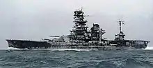 In 1931–1933 the AA guns were replaced with eight 12.7-centimetre (5 in) Type 89 dual-purpose guns, placed beside the forward superstructure in four twin-gun mounts.[11] Two twin-gun mounts for license-built Vickers two-pounder (4-centimetre (1.6 in)) light AA guns were also added while the pair of 14 cm guns on the upper deck were removed.[12]