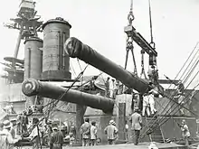 Installation of a 35.6-centimetre gun in Hyūga's No. 4 gun turret