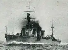 Yura, named after the Yura River,[11] was laid down on 21 May 1921 at the Sasebo Naval Arsenal, launched on 15 February 1922 and completed on 20 March 1923.[12] The ship became the flagship of the 5th Cruiser Squadron (Sendai) which included her sister ships Nagara, Natori, and Kinu on 1 April. Together with 2nd Destroyer Squadron, the 5th Squadron patrolled Chinese waters between 25 August and 4 September. The squadron, now consisting of Yura, Nagara and Natori, was assigned to the Second Fleet on 1 December. Reinforced by the light cruiser Sendai in May, the division made a cruise to Hahajima Island in October 1924. On 1 December, Yura became a private ship in the 5th Squadron which patrolled Chinese waters off the Yangtze River delta, Qingdao (Tsingtao) and Dalian (Dairen) from 25 March to 23 April 1925. The squadron made another cruise off Qindao beginning on 29 March 1926, but Yura returned to Sasebo on 1 April.[13] She was commanded by Captain Soemu Toyoda from November 1926 to November 1927[14] and became flagship of Submarine Squadron 1 on 1 December. Two weeks later, the ship began trials with a Yokosuka E1Y2 floatplane and led her squadron on a patrol off Qindao from 26–27 March to 16 April 1927 together with the Third Cruiser Squadron. Yura was reduced to reserve at Sasebo on 1 December 1927.[15]
