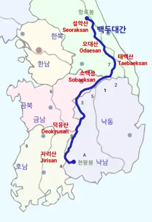 According to several texts of the Jeonggamnok, the sipseungji 十勝地 are ten places where you can live in peace and take refuge from hunger and war. Here the names of nowadays are from the Chosun Ilbo, and the comments from the Nam Sago Secret as translated by Jorgensen.[33] The blue line is 백두대간, Baekdu-daegan, the largest and longest mountain range on the Korean Peninsula from Mt. Baekdu to Mt. Jirisan.