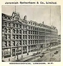 In 1898 the four partners put the store up for sale for £500,000 via a stock market flotation. They agreed to stay on as directors to ensure a continuity of business arrangements and to liaise with stakeholders. At the time of Rotherham's death, several of the buildings in Shoreditch High Street appear to have been leased,[16] however by the time of the sale the company's property portfolio was said to be mostly freehold, including the main store in Shoreditch High Street, numbers 80, 81, 82, 83, 84, 85, 86, 87, 88, 89, 90 and 91, plus the building to the rear in Boundary Street, numbers 17, 19, 21, 23, 25, 31, 33 and 35.[17] There is no mention in the prospectus of Rotherham's niece and nephew being involved in the sale of the store, so it appears that their interest in the business had been sold to the partners. Similar stock market flotation of privately owned department stores at this time included Harrods in 1889, William Whiteley (Universal Provider) in 1899 and D. H. Evans & Co in 1894. These stores were able to raise funding on the stock market for expansion and to purchase other smaller stores, for example Harrods purchased Dickins & Jones in 1914.[18] The application for shares in Jeremiah Rotherham & Co. was heavily oversubscribed and about two years later a further sale of debenture and ordinary shares was offered.[19] The dividend paid to shareholders for many years was between five and seven percent.[20]