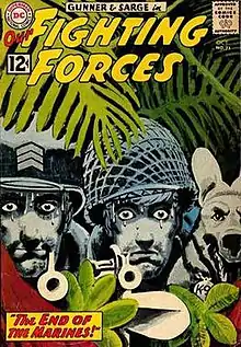 DC war-comics editor and writer Robert Kanigher recalled that on the feature "Gunner and Sarge" in particular, Grandenetti "managed to get the grime and the humor of the two Marines (and, eventually their wonderful Pooch) fighting in the jungle as no one else could. Jerry liked to experiment and I had to sit on him to get him to stop it. Especially in his covers, which were outstanding, when I forced him to draw as realistically as possible".[8] With Kanigher, Grandenetti co-created the feature "Mlle. Marie", about a World War II French Resistance fighter, in Star Spangled War Stories #84 (Aug. 1959).[7][9]
