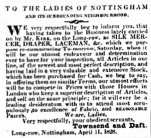 - ↑ "William Daft, Silk Mercer, Haberdasher, &c". Nottingham Review and General Advertiser for the Midland Counties. England. 27 March 1840. Retrieved 12 March 2018 – via British Newspaper Archive.
