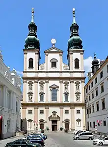 The Jesuit Church (German: Jesuitenkirche), also known as the University Church (German: Universitätskirche), is a two-floor, double-tower church in Vienna, Austria. Influenced by early Baroque principles, the church was remodeled by Andrea Pozzo between 1703 and 1705. The Jesuit Church is located on Dr. Ignaz Seipel-Platz, immediately adjacent to the old University of Vienna buildings.