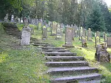 The Jewish community at Buttenhausen was established by Baron Phillip Friedrich von Liebenstein by a charter of 7 July 1797.[2] Motivated by the desire to stimulate economic activity in the village, he invited twenty-five Jewish families to settle there under his protection. One of the privileges granted to the new community was the right to establish a cemetery above the new Jewish quarter. By 1870, Buttenhausen's Jewish residents numbered 442 in a total population of 800 and lived in 46 of the village's 100 houses.[3] The oldest legible inscription in the cemetery dates from 1802; the last burials took place in 1943, shortly before the final deportations of Jews from the village. Today, 399 gravestones survive from the period of the cemetery's use.[4]