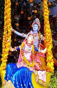 Jhulan Purnima, Jhulan Yatra or Hindola is a Hindu swinging festival that is dedicated to Hindu god Krishna and goddess Radha.[1] It is popularly celebrated by the Hindu Vaishnava sect in the month of Shravana (July-August) which falls under the monsoon season in India when the weather is hot, humid and slightly breezy.[2][3] This festival is known for its display of decorated swings, songs and dance. It is a joyful festival which celebrates the amour of divine couple Radha and Krishna along with the romantic fervor of the rainy season in India.