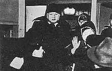The group's public rituals included eating donated rice gruel, which attracted both followers (malnutrition was a major problem during early occupation) along with police and media attention.[30] According to a SCAP report, about a hundred followers were observed participating in a public ritual.[18] Police surveillance intensified after members of Jiu, believing that Supreme Commander for the Allied Powers Douglas MacArthur was now part of the world renewal, stopped MacArthur's car outside the United States embassy in an attempt to make contact with him in May 1946.[31][32] Go Seigen, who was still a famous public figure, became a key figure in their campaign.[33] The recently retired but popular sumo wrestler Futabayama Sadaji also became a follower.[34][35] In October 1946, the Asahi Shimbun visited the group's compound in Suginami.[16]
