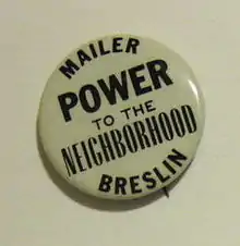 In 1969, Breslin ran for president of the New York City Council in tandem with Norman Mailer, who was seeking election as mayor, on the unsuccessful independent 51st State ticket advocating secession of the city from the rest of the state. A memorable quotation of his from the experience: "I am mortified to have taken part in a process that required bars to be closed."[18] The ticket was referred to as "Vote the Rascals In".[19][20]