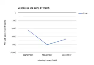 - September 2010 - 27,000 jobs lost (According to U.S. Labor Department, 64,000 private sector jobs are added but a net loss of 95,000 jobs are due to government layoffs) [7][8]