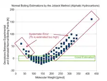 The formula used for the prediction of the normal boiling point shows another problem. Joback assumed a constant contribution of added groups in homologous series like the alkanes. This doesn't describe the real behavior of the normal boiling points correctly.[5] Instead of the constant contribution, a decrease of the contribution with increasing number of groups must be applied. The chosen formula of the Joback method leads to high deviations for large and small molecules and an acceptable good estimation only for mid-sized components.