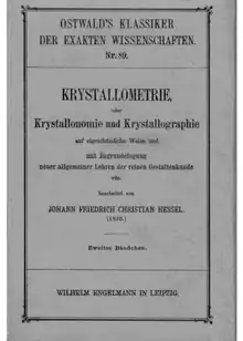 Hessel's work originally appeared in 1830 as an article in Gehler’s Physikalische Wörterbuch (Gehler's Physics Dictionary). It went unnoticed until it was republished in 1897 as part of a collection of papers on crystallography in Oswalds Klassiker der exakten Wissenschaften (Ostwald's Classics of the Exact Sciences). Prior to this posthumous re-publication of Hessel's investigations, similar findings had been reported by the French scientist Auguste Bravais (1811–1863) in Extrait J. Math., Pures et Applique ́es (in 1849) and by the Russian crystallographer Alex V. Gadolin (1828 - 1892) in 1867.