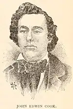 - John Edwin Cook, sometimes spelled Cooke, 29, born in Haddam, Connecticut,[70] but was from Pennsylvania.[13]: 24 He had been a teacher.[71] He was Brown's second in command, by one report,[72] had been with Brown in Kansas,[7]: 6 and had lived undercover for over a year in Harpers Ferry.[7]: 2 He was described as "a man of some intelligence",[72] "a quick-witted, intelligent man",[73] from a good family, who had studied law and taught school.[74][75] He escaped into Pennsylvania after the raid, but Governor Wise offered a reward of $1,000,[76] and he was soon captured.[77][78] His attorney at the time, Alexander McClure, published lengthy recollections.[79] A band played as he was taken from the jail in Chambersburg to the train that would take him to Charles Town for trial.[80]