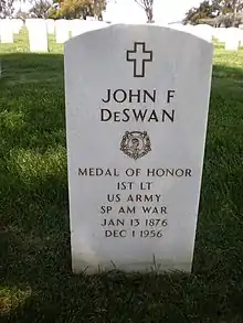 - 1 2 "War with Spain; De Swan, John F." Medal of Honor recipients, War With Spain. United States Army Center of Military History. August 3, 2009. Archived from the original on April 23, 2009. Retrieved August 2, 2010.