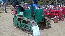 Production of ploughing engines ceased in 1935.[2]The last Fowler steam driven vehicle was a steam roller produced in 1937.[3] The main products produced by Fowler during the 1930s were their range of tracked tractors, the FD2, FD3 and FD4, powered by Fowler-Sanders diesel engines of 2, 3, and 4 cylinders. They also produced the Fowler Gyrotiller from 1927 - this was a large tracked vehicle 34 foot long and 10ft 6in wide powered initially by a 225hp Ricardo petrol engine, later by a 170hp MAN diesel. It was claimed it could convert virgin territory to seed-bed in one pass and at a rate of an acre per hour.[4] Later versions of the gyrotiller were produced as attachments to the standard Fowler diesel crawler range with Fowler-Sanders engines of 30, 40 and 80hp. A total of 88 gyrotillers were produced.[5]